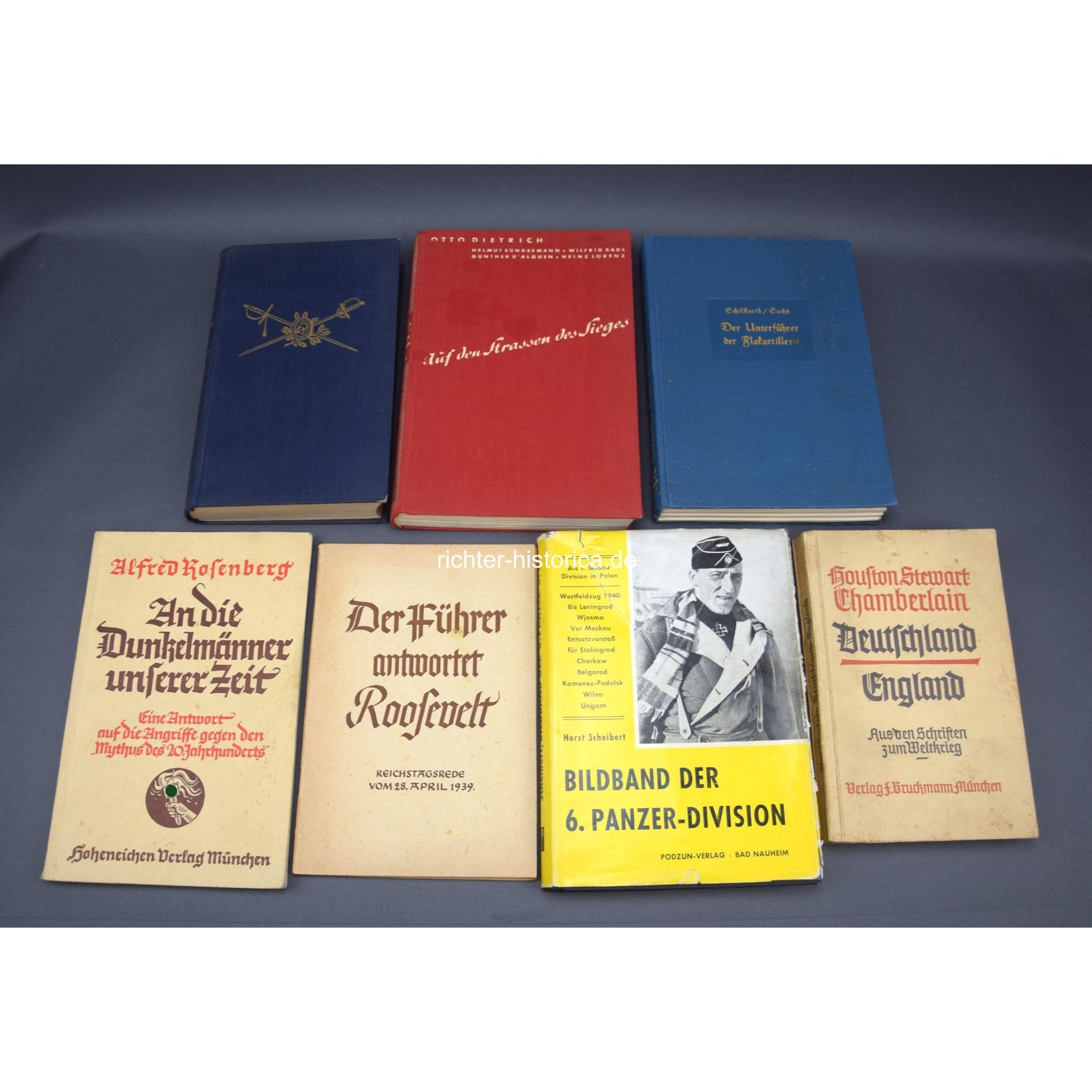 Insgesamt 4 Bücher und 3 Taschenbücher, 3.Reich, Lehrbücher, Bildband der 6.Panzer-Division, Propaganda Hefte. Teilweise beschriftet und gestempelt, Zustand 2-3.