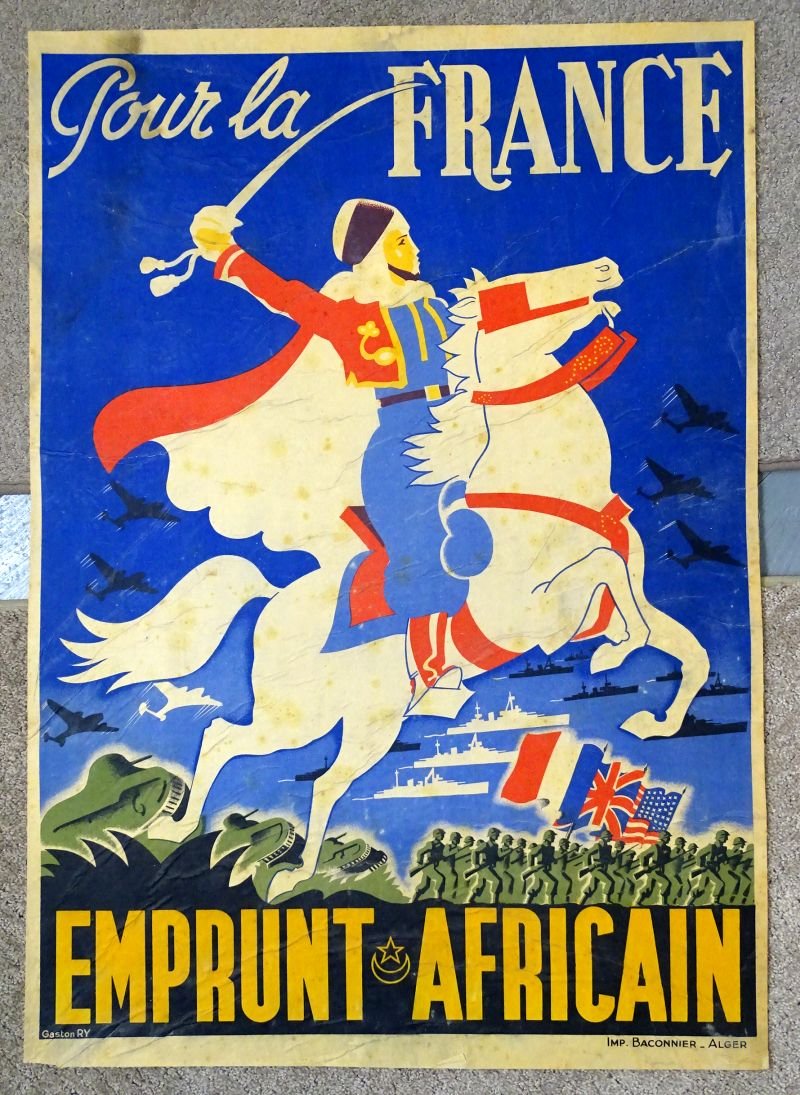 Approximately 23 inches by 32-3/4 inches. Printed in Algeria. The poster was mounted on linen long ago, and the poster shows wrinkles from that mounting process. The poster also shows some edge tears and spots, with signs of age.