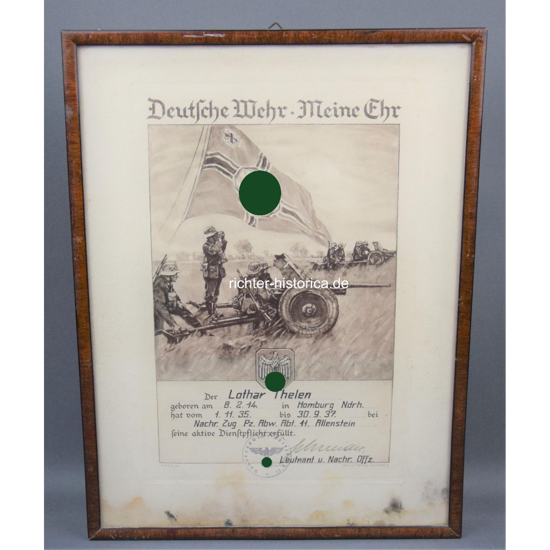 Große Schmuckurkunde, aktive Dienstpflicht Erfüllung des Trägers Lothar Thelen, am 30.09.1937. Er erfüllte seine Dienstzeit bei demNachrichten Zug Panzer. Abwehr Abteilung Nr.11(später in Panzerjäger-Abteilung 11 umbenannt). Hinter Glas, gerahmt. Schöner Holzrahmen. Maße mit Rahmen: 36,5x27,5cm.
