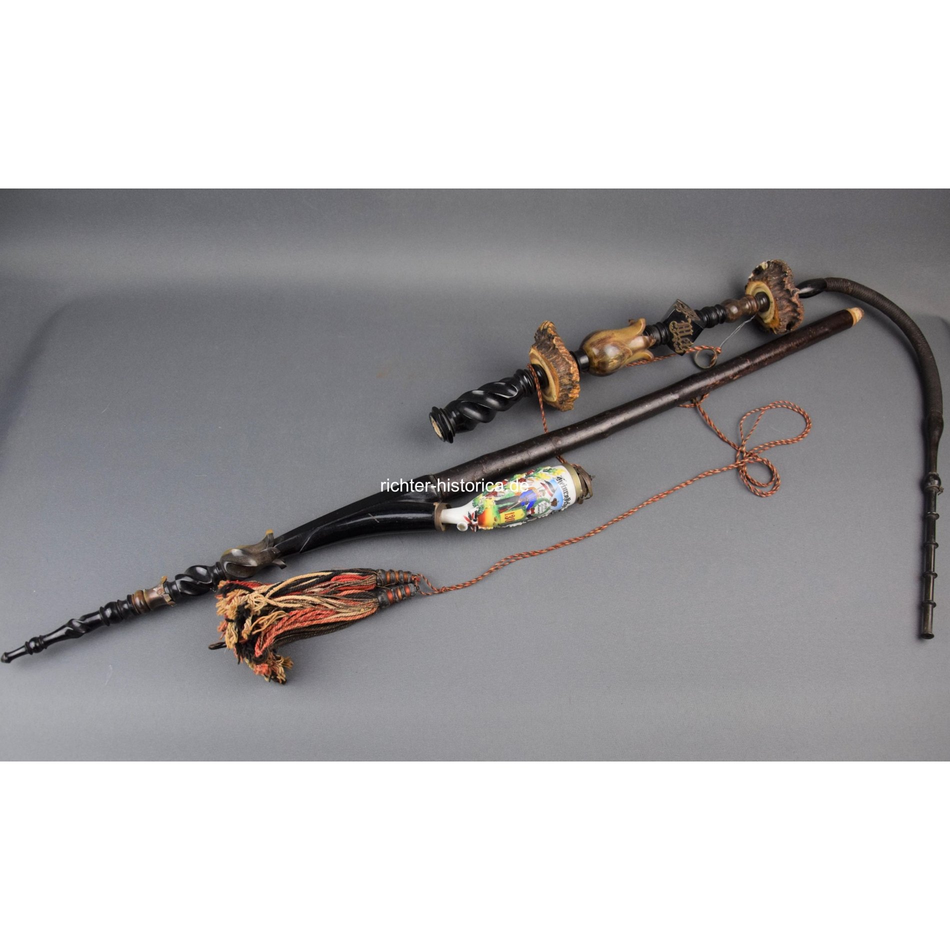 Reservistenpfeife mit hanbemalten Porzellankopf. Zum Andenken von Ernst bd. 1 Comp. Lothar. Inf. Rgt. No 13 in Metz 1913. Lothringisches Infanterie-Regiment Nr.13 in Metz, Frankreich. Mehrteiliges Pfeifenrohr und Mundstück. Der Porzellankopf unbeschädigt. Das Mittelstück mit abgenutztem Gewinde. Die Pfeife mir einem kleinen Abbruch. Oberhalb ebenfalls mit 'Metz' markiert in Form von aufgesetzten Buchstaben. Gesamthöhe: 128cm. Seltene und fast vollständige Reservistenpfeife.