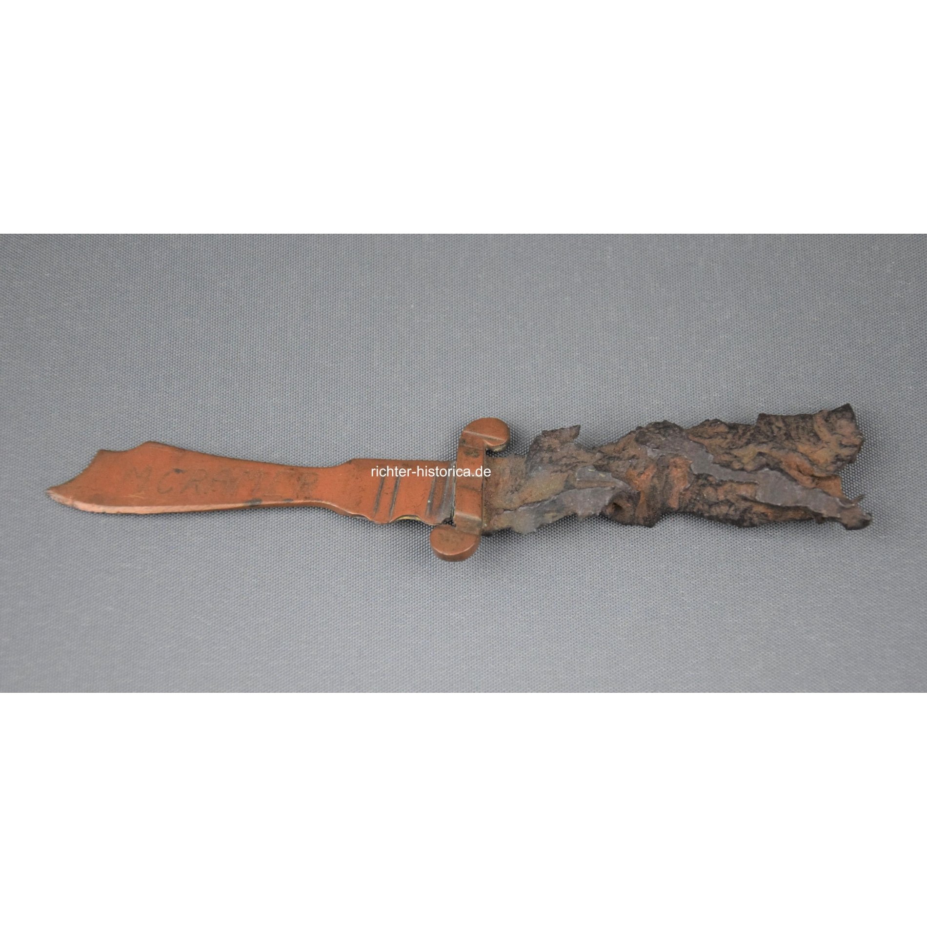 Brieföffner gefertigt aus Granatsplittern. Auf der Klinge mit Aufschrift 'Argonnen 1916' auf der anderen Seite mit Trägernamen 'M.Cramer'. Länge insgesamt 15,5cm.