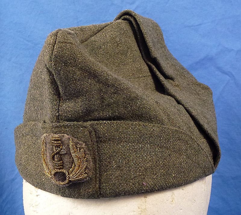 The field gray wool Bustina cap bears the insignia of the Italian fascist MVSN, the 'Milizia Volontaria per la Sicurezza Nazionale', or'Voluntary Militia for National Security' (the 'Blackshirts'). The interior lining bears the stamp of 'I.R.', and a size stamp of '57'. There is a very small exterior hole on the left side at the bottom edge. The interior leather sweatband is present and intact. Overall the cap is in excellent used condition.