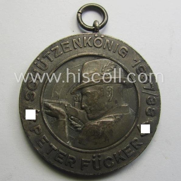 Unusually seen, frosted-silver-toned and TR-period shooting-medal showing on its front a uniformed hunter and that is entitled: 'Schützenkönig 1937/38 - Peter Fücker'