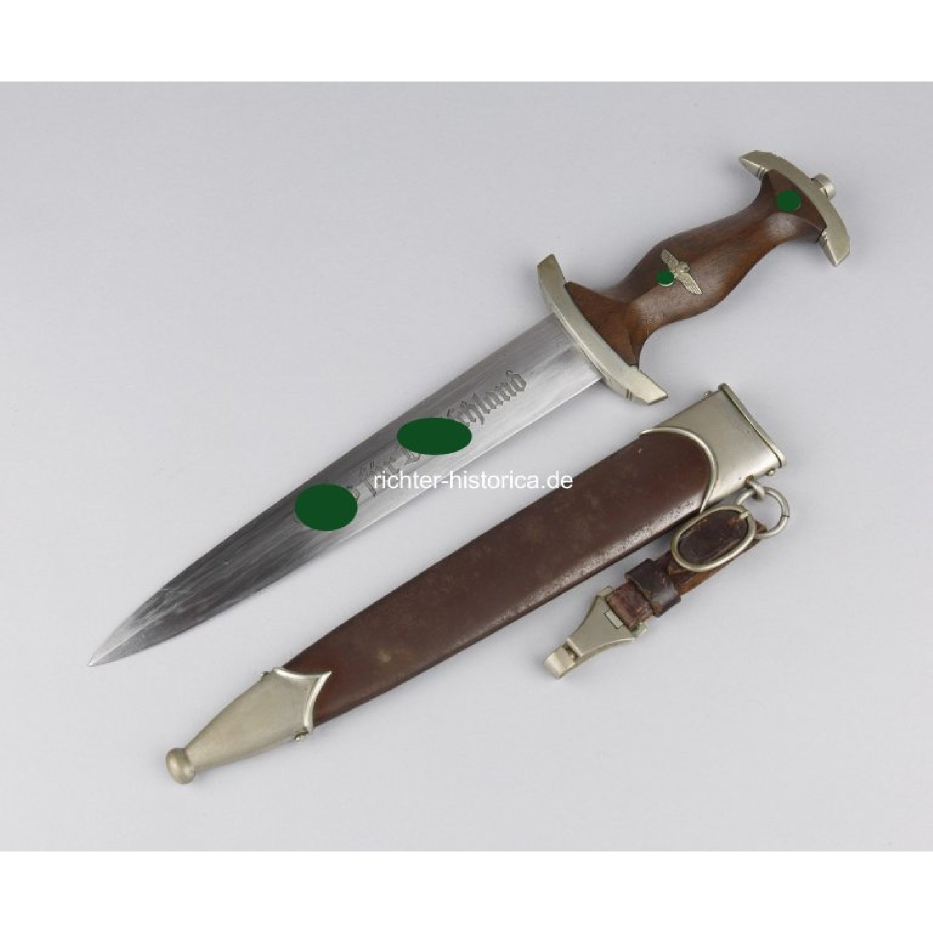 Früher SA-Dienstdolch mit Hersteller auf der Klinge 'J.P. Sauer & Sohn, Suhl Gegr. 1751' Die Griffschalen aus Holz gefertigt, gut erhalten, ohne Ausbrüche. Die Parierstangen und der Adler aus Neusilber gefertigt, der SA-Adler sauber eingesetzt. Die Kopfschraube unberührt. Auf der Parierstange mit Gruppenstempel 'Fr' für Franken. Blanke und saubere Klinge, mit Plistspuren, die Spitze vollständig, leichte Kratzer am Rand der Klinge (die Klinge selbst ist nicht geschliffen!). Die zugehörige Scheide brüniert, Lagerspuren vorhanden. Der Ortball nicht eingedrückt. Dazu ein früher SA-Lederhänger. Zustand 2.Kein Verkauf an Personen unter 18 Jahren, Altersnachweiß beim Kauf erforderlich.