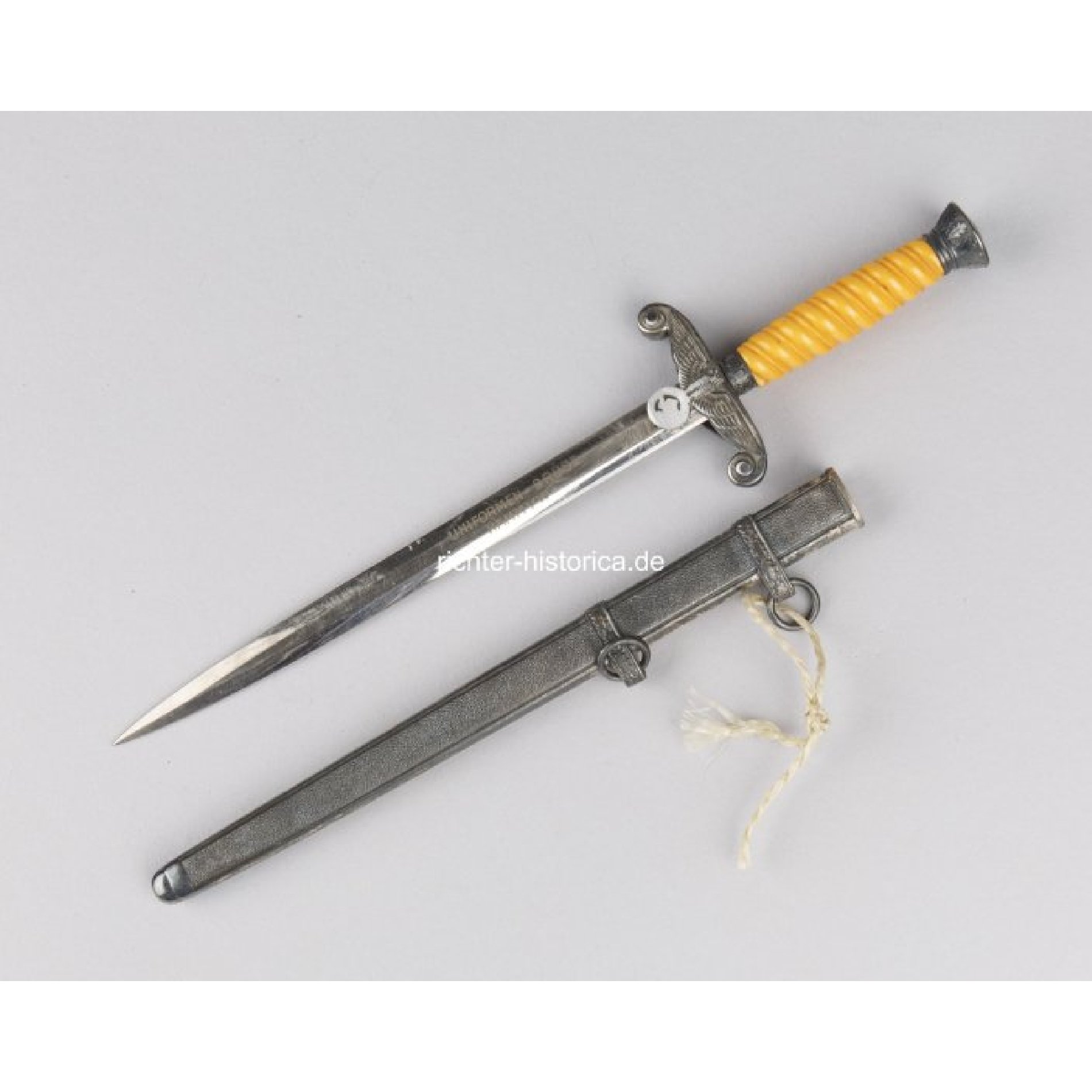 Miniatur vom Heeres Offiziersdolch der Wehrmacht, entnazifiziertes Stück, die Scheide nicht passend zum Dolch, der Dolch liegt lose in der Scheide. Die Klinge mit Gravur 'Uniformen Bruse Hamm'/W' und Hersteller Logo Alcoso Solingen. Zustand 3-4.Bastlerstück.