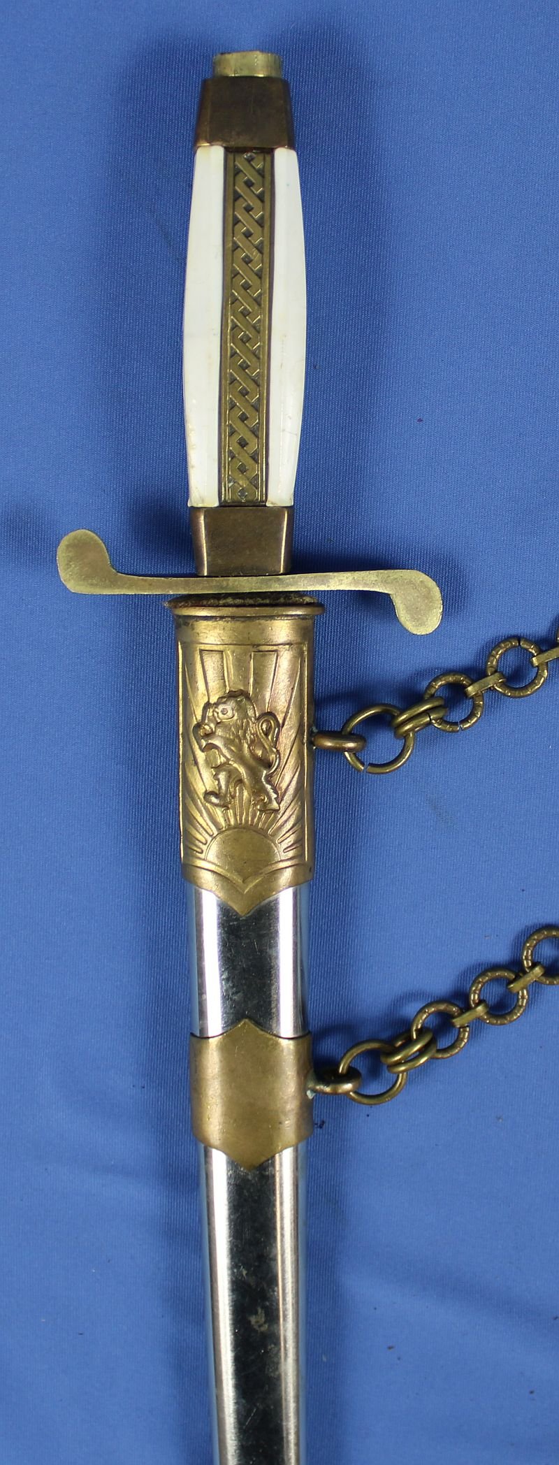 The blade of the dagger shows old dried oil, and the dagger fittings exhibit uncleaned patina. The grip is without chips or cracks, and overall the dagger is in very good condition.