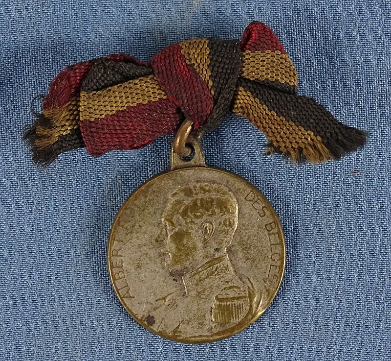 approximately 3/4 of an inch in diameter. The medal shows wear to the silver finish. The ribbon is soiled and age toned.