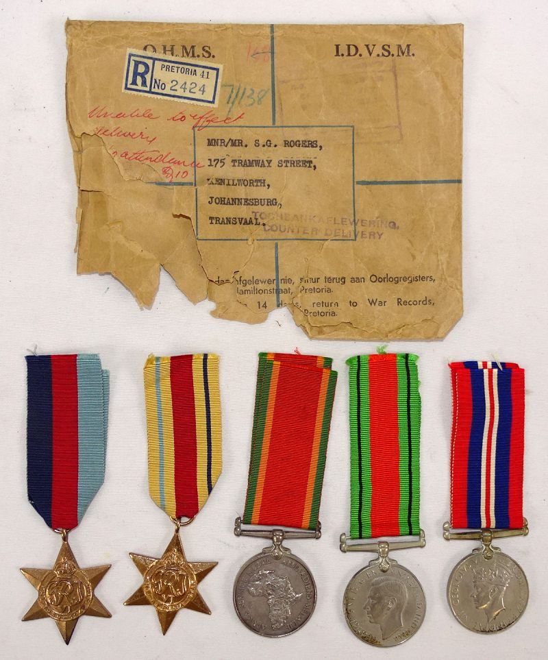 The group is comprised of the 1939-1945 Star; the Africa Star; the Africa Service Medal of South Africa; The Defense Medal; and the 1839-1945 War Medal. All of the medals are named to '100127 S.G. Rogers'. The medals are accompanied by the mailing address label for the box in which the medals were sent to the recipient in Johannesburg. The medals are in excellent condition.