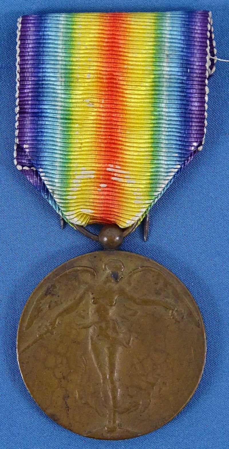 The medal has a dark patina and the ribbon shows age. The suspension prongs are present.