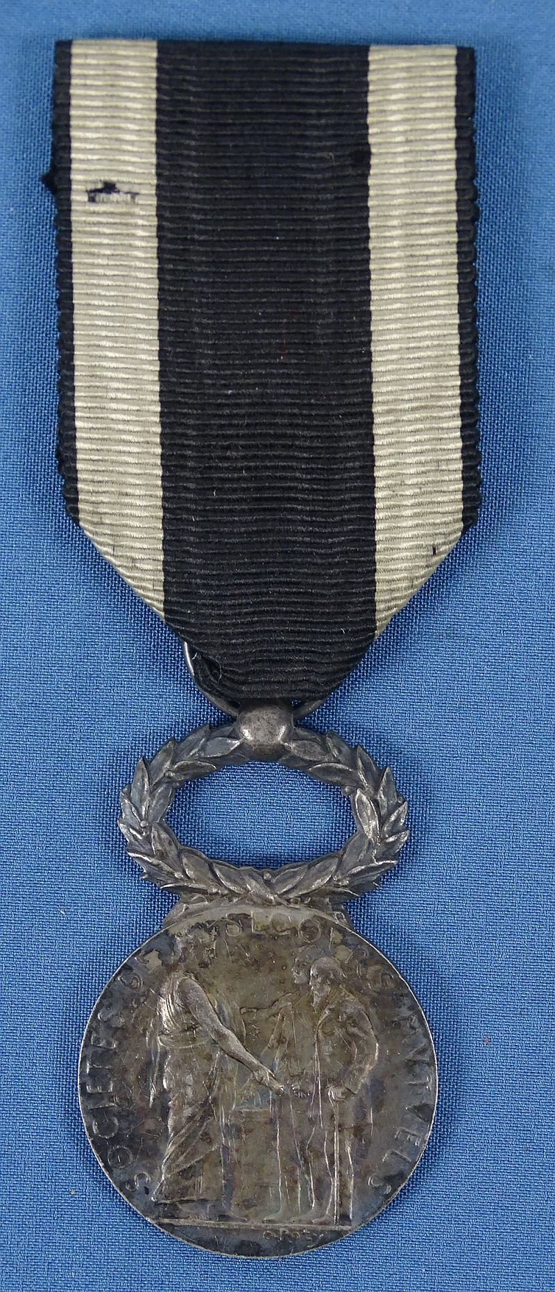 The medal has uncleaned patina. The ribbon shows wear.
