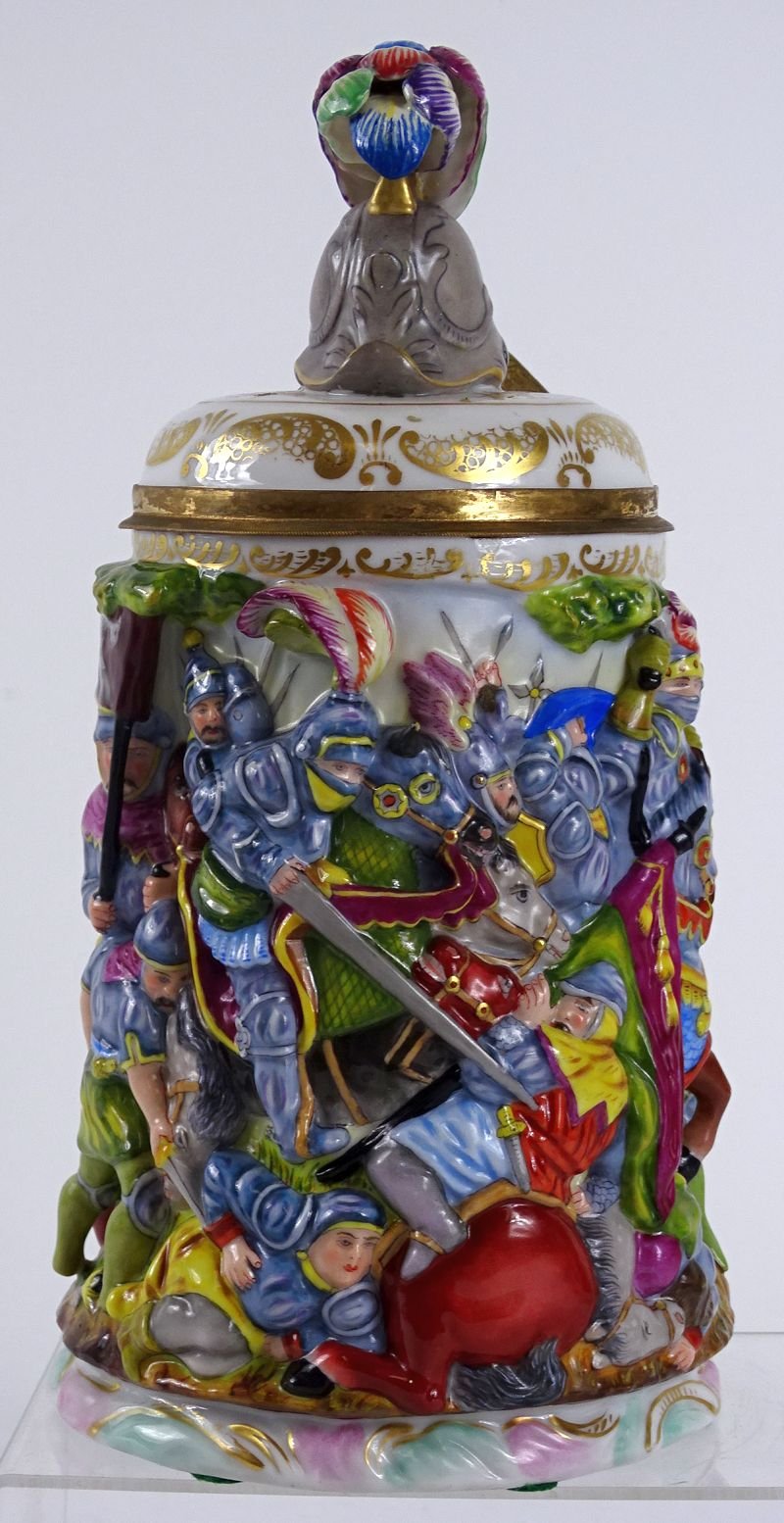 A porcelain stein, approximately 9 1/2 inches tall overall. Excellent condition, without chips or cracks. The base bears the Capo di Monte mark of a crown over an 'N', although the 'N' was not completely stamped. Near mint condition, without chips or cracks. The base had six small felt pads placed upon it to cushion it, those pads likely being removable.