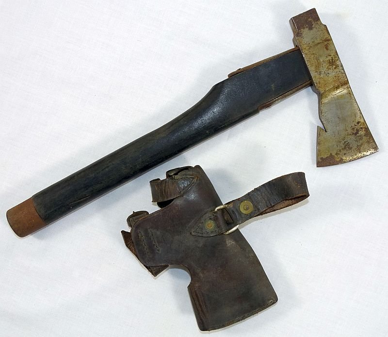 The head of the ax shows use, with areas of rust and corrosion resulting in pitting. While most fire axes feature a cutting blade on one side and a pick on the opposite side, this example has a hammer style design on the side of the head opposite the cutting edge. The cap at the base of the black grip bears a coating of light rust. The head of the ax bears a maker's mark of a sword piercing a crown. The brown leather cover is complete and intact, with the belt loop being somewhat dry. The ax has an overall length of approximately 13 1/4 inches.