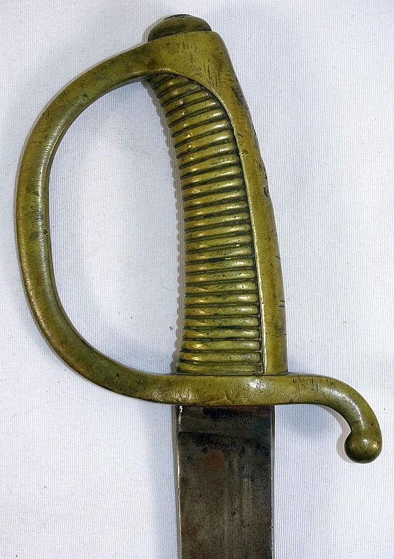 The sword has an overall length of approximately 28 1/2 inches long, with a blade length of approximately 23 inches. The blade is generally bright with typical gray spots and several very small nicks to the cutting edge. The brass grip and guard show uncleaned patina and small indentations from use and carrying wear. There is a number impressed into the guard that appears to be '11740'.