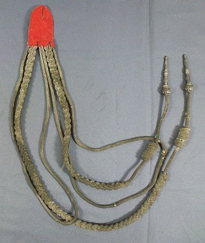 Circa late 19th or early 20th century dress aiguilette cords. Red wool mounting lozenge with a buttonhole, two braided cords with silvered metal 'whistles' and two narrow looped cords. The cords are toned with age patina and there are a few spots where the cords are frayed, exposing the interior lining, but the set appears to be complete and intact. However, most such cords usually have narrow loops of thread to suspend the aiguilette cords from uniform buttons, and these cords have no such loops.