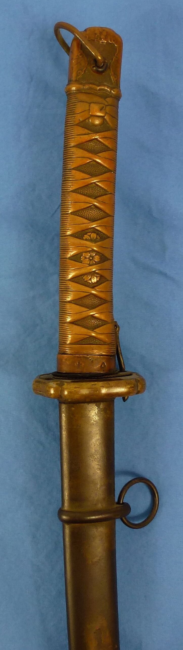 The uncommon copper handled sword has an overall length of the scabbard of approximately 37-1/2 inches, with a blade length of approximately 26 inches. The blade shows spots, surface grime, some minor pitting and wear to the finish, but the blade is without nicks, chips or active rust. The blade is numbered '5118', next to which is the inspector mark of the Tokyo arsenal. The fuchi collar has the mark of the Suya sword company as well as the Tokyo arsenal inspector mark as well as the mark of the Kokura arsenal inspection mark. The sword has a pierced guard tsuba. The guard, fuchi collar and the grip all exhibit uncleaned patina. The scabbard has wear to the paint. The scabbard throat bears the matching number of '5118'. Overall the sword is in very good field used condition.
