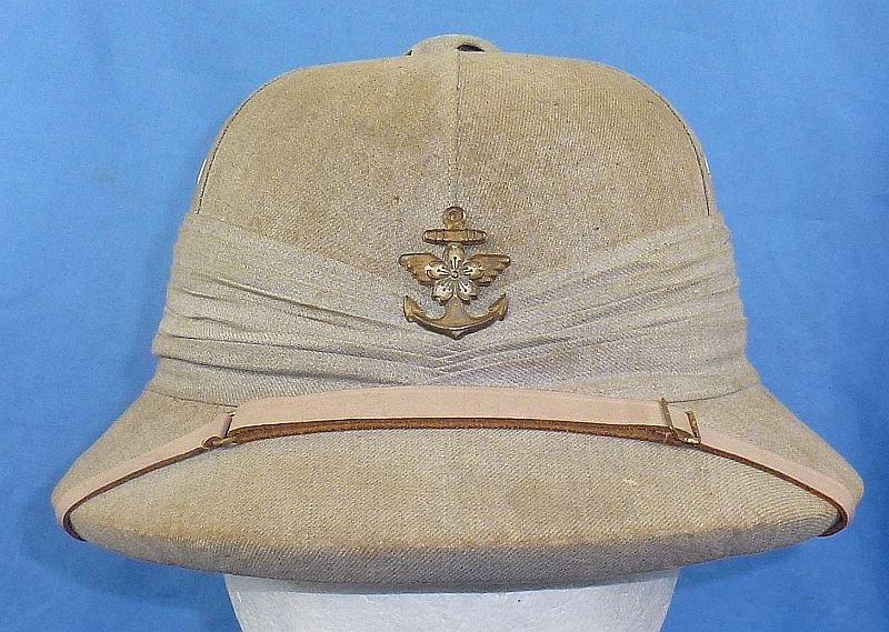 The cork pith helmet is covered in a textured blue gray cotton fabric, with the front of the helmet bearing the brass insignia of the construction units of the Imperial Japanese Navy. The exterior shows some surface soiling and typical fading from sun exposure. The full interior leather sweatband is present, with a maker label in the dome of a helmet. The chin strap is in place across the front visor. Overall excellent field used condition.