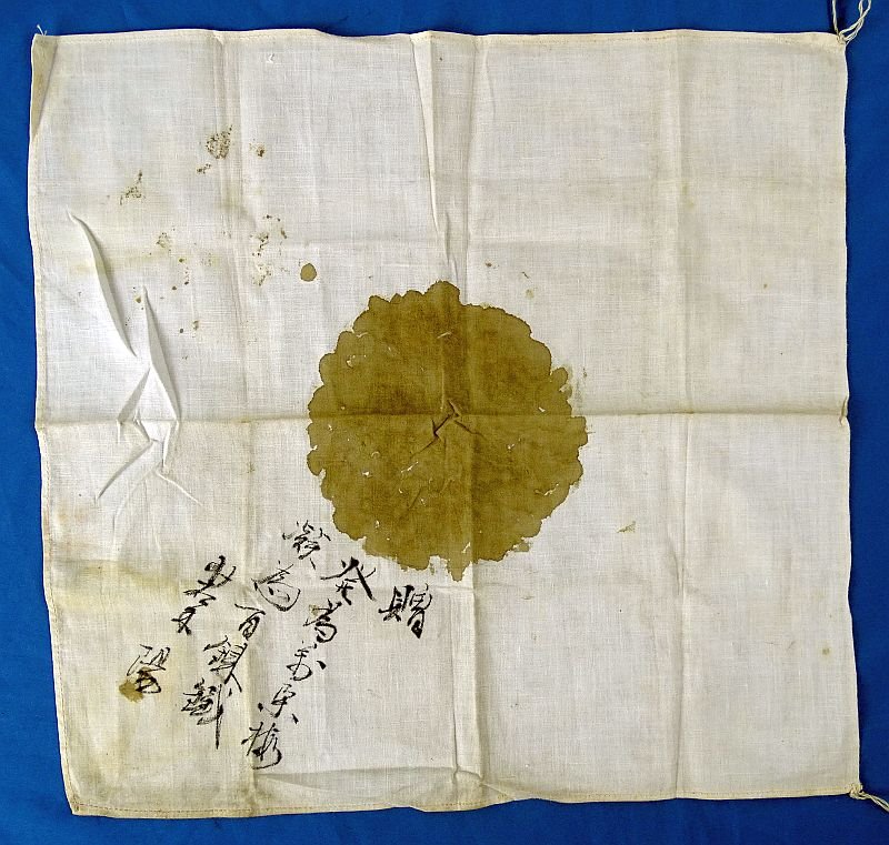 The flag is cotton and it is approximately 12-3/4 inches by 13 inches, with string ties at two corners. It bears handwritten kanji which include the phrases 'Gift', 'For Departure' and 'For Constant Training', with other kanji not being completely legible, and so they are certainly part of a lengthier slogan such as 'Constant Training Yields Self Realization'. The flag bears the name of 'Wakagi Kiyoshi'. The rising sun in the center was made from blood. The flag shows spots and age toning, but it is without holes or damage.