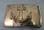 Original era manufacture. Chromed alloy friction buckle worn on a cloth belt with the IJN issue tropical shorts or trousers. Light age and wear. This pattern is considerably wider than the more often encountered enlisted variety.
