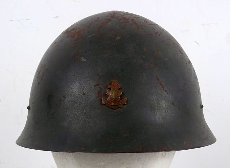 The helmet has the painted gray exterior and interior that is the distinctive mark of the Imperial Navy combat helmets that were worn by personnel assigned to serve on the ships of the Navy. The exterior paint is approximately 85 percent intact, with typical scrapes and scuffs and scattered spots of surface rust. The front of the helmet displays the metal anchor and cherry blossom insignia of the Imperial Navy. The leather liner is present, showing wear. The tips of the six leather tongues are torn and the drawstring is missing. Two of the leather pads retain the filling in the 'pillows' behind the pads. The leather liner band has separated into sections that are presently retained in place by removable paper clips, but the liner is complete. The fabric chin strap is present, showing spots and use, but it is intact.