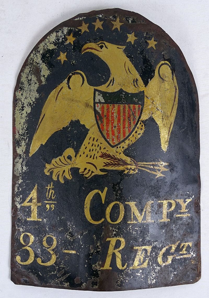 Painted Tin Militia Hat Plate, circa 1820. The tombstone-shaped plate is decorated with seven gilt stars above a gilt spread wing eagle with a polychrome painted American shield on its breast. Below the eagle is the gilt designation of '4th COMP'Y' and '33- REG'T.'. The plate is approximately 9 1/4 inches high by 6 1/2 inches wide. Each lower side of the plate has sets of three small holes for securing the plate to the headgear. The plate shows some paint loss but overall it is in excellent condition. A piece of cellophane tape on the reverse secures a segment of clear fishing line that was used to hang the plate for display.