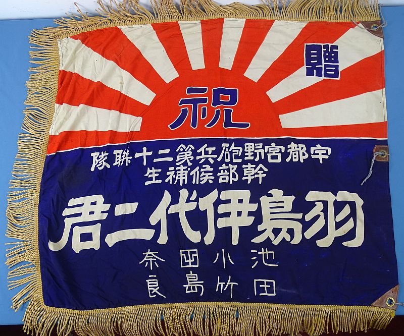 The silk flag is approximately 28 inches by 32 inches, exclusive of the fringe. The flag has three leather reinforced grommets on the hoist edge. The flag has some spots, as well as small scattered holes, but the colors are bright and the flag makes an impressive appearance. The flag bears kanji which read 'Congratulations Utsunomiya Field Artillery 20th Regiment Officer Cadets', with the flag naming graduating officer cadet 'Mr. Hatori Iyoji', as well as including the names of four other officer cadets: Ikeda; Otake; Shijima; and Nara. 'Utsunomiya' is located north of Tokyo in Tochigi Prefecture. The 20th Field Artillery Regiment was part of the 14th Infantry Division.In August 1942, the 14th Division was sent to Manchukuo, and assigned to garrison duty. As the situation in the Pacific War against the United States continued to deteriorate, the Supreme War Council began transferring forces out of Manchukuo to the southern operational areas. The 14th Division under the command of Lieutenant General Sadae Inoue was assigned to Palau 24 April 1944, with its 2nd regiment and 3rd battalion of 15th regiment were sent to the island of Peleliu, one battalion of its 59th Infantry Regiment stationed on the island of Angaur, and the rest of the 59th regiment and 15th regiment were sent to the Babeldaob island along with divisional headquarters. Before departure, the infantry regiments were reorganized, absorbing divisional engineers, artillery, transport and reconnaissance units. The loss of machine cannon company during transportation also has resulted in abandonment of the plans to deploy a newly created 22nd independent mixed engineer regiment to the western New Guinea. The subsequent Battle of Peleliu and Battle of Angaur were among the fiercest of the Pacific War. At Angaur, 1338 of the 1400 defenders were killed, and at Peleliu, 10,695 of the 11,000 defenders perished from 15 September 1944 to 24 November 1944. As the troops on Peleliu were wiped out, the transfer of the 2nd battalion of 15th regiment to Peleliu was cancelled. The Babeldaob was never invaded, but the units stationed there suffered severe casualties due to airstrikes and starvation nonetheless.