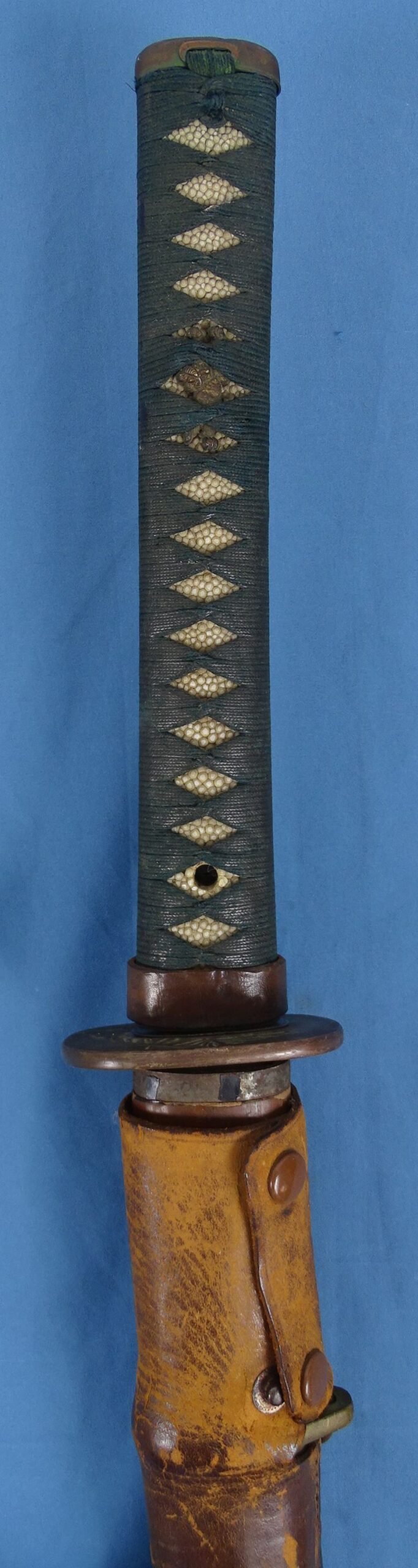 The sword has an overall length in the scabbard of approximately 38-1/2 inches, with a blade length of approximately 26 inches. The blade is generally bright, with some spots and speckling. The blade exhibits a visible temper line. One side of the blade bears Chinese kanji with the dedication of 'Sincerely presented by Mr. Zhonghui and Chen Huicun'. The sword tang is signed 'Kaneyoshi.'. The pommel, fuchi collar, and the tsuba guard are civilian mounts with engraved floral designs, a beetle, and a dragonfly. The fuchi collar bears an engraved name that is not entirely legible of 'Ichi (illegible) saku'. The grip is covered in ray skin, wrapped i the traditional fashion in blue-green fabric. Beneath the fabric wrappings on each side are civilian menuki. The scabbard has a leather comber cover which shows typical scuffs and wear from use in the field. The horizontal portion of the leather snap strap around the base of the grip is broken immediately underneath the rivet, but the snap strap remains present and complete.