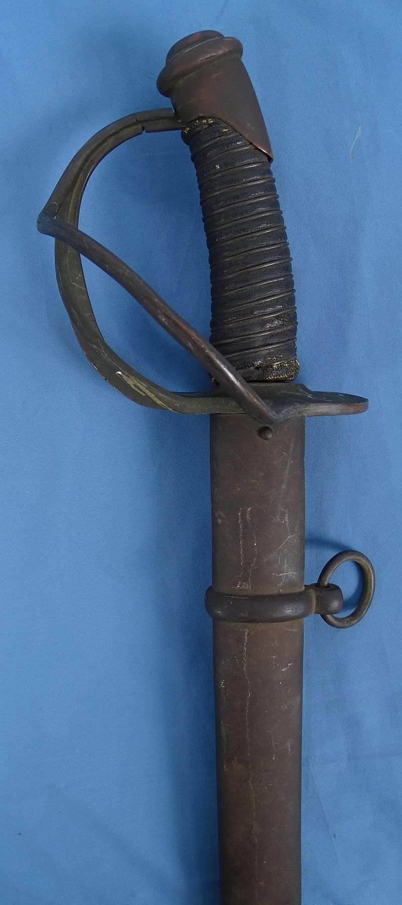 The saber has an overall length in the scabbard of approximately 43 inches, with a blade length of approximately 35 inches. The blade is typical Confederate production, with a shallow unstopped fuller, showing no ricasso. The blade has dark areas but it is without nicks, chips, or active rust and makes a fine appearance. The guard has a dark, uncleaned patina. The underside of the guard is marked 'XXXX'. The blade is a bit loose where the tang enters the guard, but the sword assembly is secure and intact. The wood grip is covered in oil cloth which shows minor wear. The grip is wrapped with a single strand of wire. The scabbard is a European import example that has clearly been with the sword for the length of its service life, showing wear and use that matches that of the sword. The scabbard exhibits surface rust on both sides, with a few shallow indentations. Overall the saber has immense character and it is in very good condition.