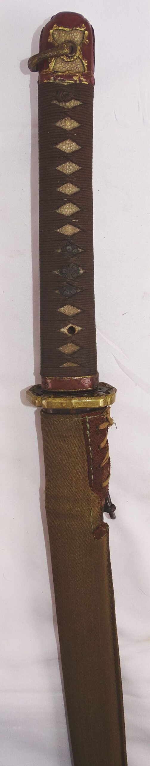 The sword has an overall length in the scabbard of approximately 39 inches with a blade length of approximately 26 inches. The blade is relatively bright, with some scratches and surface dirt, but without nicks or chips, no visible temper line. The tang is signed 'Tomatsu Kaneharu'. His real name was Tomatsu Naotarō, born October 14th 1917. The tsuba is the semi-solid style with gilt finish and cherry blossom motif and a single opening to accommodate the possible use of a leather strap that would have passed through the opening and fastened onto a snap on a leather combat cover.. The grip is covered in light ray skin, with a wrap in the traditional fashion in dark brown tape. Beneath the wrap on each side are the standard military menuki with three cherry blossoms. The metal scabbard is contained within a heavy, olive brown, cotton combat cover . Overall the sword is in very good condition.