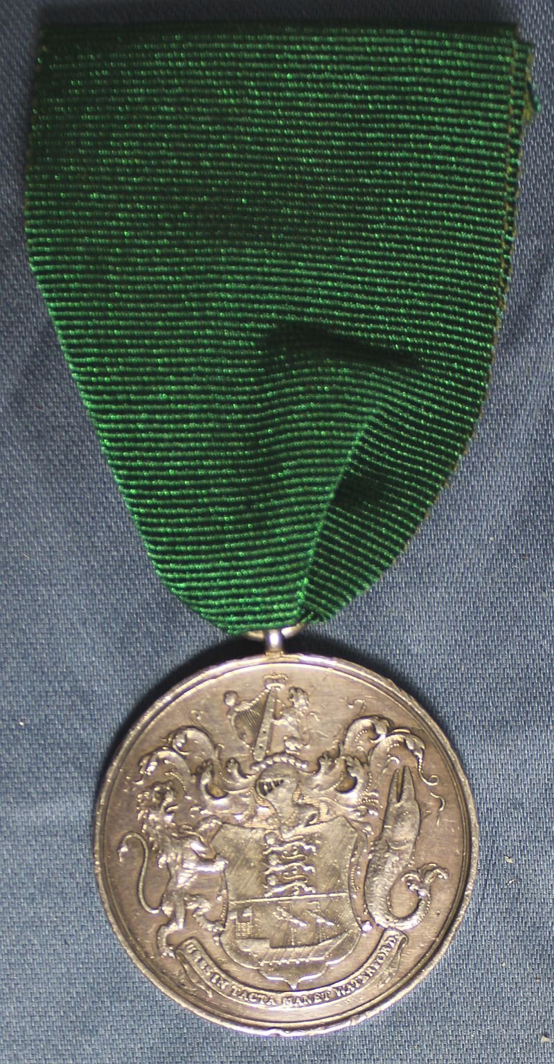 The South Devon Militia were stationed in Waterford, Ireland from 1798-1799 at the time of the Irish Rebellion. In 1798 they effectively contained the uprising within the city, unlike other areas which suffered greatly in the unrest. Following this, the Freedom of the City was presented to the Colonel of the regiment, and certain selected members of the regiment were awarded this specially struck medal. Issued un-named, this medal engraved on the upper edge 'Richard Helier'. Replaced ribbon.