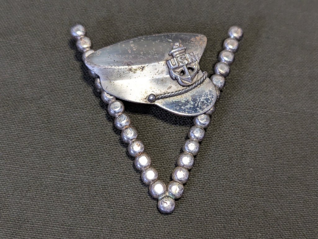 Vintage V for Victory USN sweetheart pin. Large letter V with a military hat with the US Navy insignia. Marked Sterling on the back. Nice statement piece. It does have some overall wear and tarnishing / discoloration.This pin was made different branch insignia on the hat (navy, army, air corps, marines, etc).