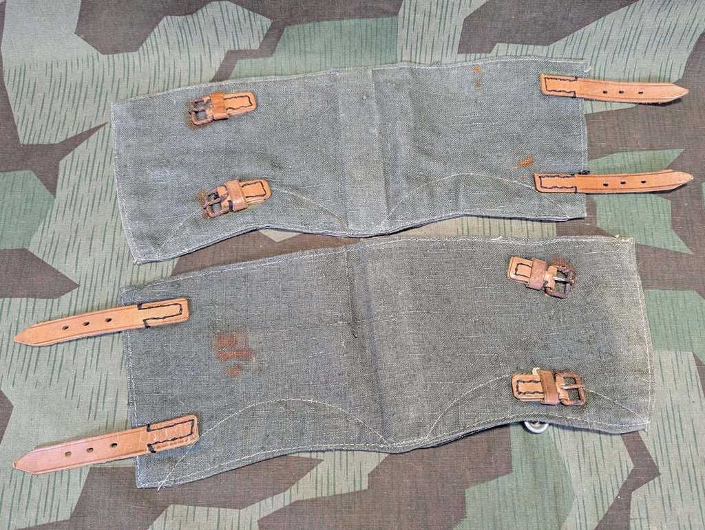 Original Gamaschen with rusty hardware and rust stains on the fabric. The rust is unfortunate, as these are unissued and and would have been great without the rust. They are still slightly nicer than many. There is a faint R.B.Nr. ink stamp of the leather straps.