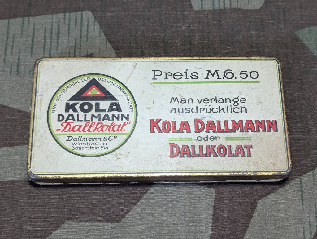 Pre-war Kola Dallmann - Dallkolat empty energy supplement tin. This was a popular 'wachhaltsmittel' in Germany from the 1920's well through the war. The inside states to eat it like chocolate and that a comfortable dose is 1 or 2. The company changed their logo a few times making it easier to date this tin as pre-war. It is in good condition with light wear and the graphics are still quite nice.