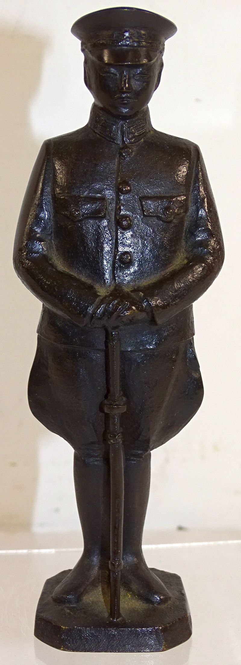 The statue has an overall height of approximately 6 3/4 inches tall, signed on the reverse base. The statue is nicely detailed, with the Japanese Army star visible on the visor cap and the sword tassel visible on the hilt of the Gunto sword. Excellent condition.