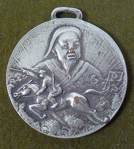 A silver metal fob or medal, approximately 1 1/4 inches in diameter. The obverse features a looming Asian figure in front of whom a cavalry charge is taking place. The image is strikingly similar to that design of the Soviet Medal for the Battle at Khalkin Gol, an engagement of the undeclared Soviet Japanese border conflicts fought among the Soviet Union, Mongolia, Japan and Manchukuo (as the Japanese called the conquered puppet state of Manchuria) in 1939. The reverse of the badge bears Mongolian writing and the Chinese kanji for the 'Koan Military School'. The cavalry charge includes a soldier carrying a flag which appears to have a crescent moon on it, and that design is similar to the flag of the Bogd Khaanate of Mongolia of the 1920's. The medal was likely produced for graduates of the school.