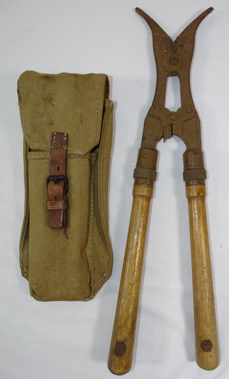 Japanese military issue wire cutters and canvas / leather pouch. Wire cutters measure 18-1/2″ overall, removable hard wood handles. Canvas case with pliable leather tab closure and complete with a pair of extra cutter blades in an interior pouch. In overall very good condition, the metal retaining about 80% original brown paint, case shows mild soiling but no damage. An uncommon piece of field gear in very nice condition.