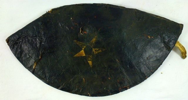 The circular hat worn by samurai, this example is made of leather with an embossed design of interlocking rings. The hat is in the 'Nirayama' style with a family crest of a five pointed star on each side. A photograph is posted with this listing which shows a samurai wearing this style of hat in the Edo period. The hat shows the expected signs of wear and use, but remains in very good condition.