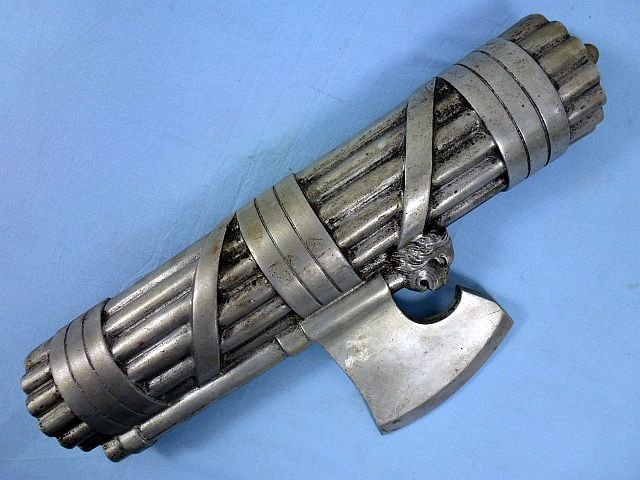 A large aluminum Italian fasces (the emblem which gave the fascists their name, 15 inches long and 7 inches wide. The fasces was likely either placed originally on an Italian government building or perhaps on an official railway car, since the style and construction of the insignia is very similar to the Third Reich Reichsbahn railway eagles. The fasces has a small protrusion at the top, this representing the central rod around which the other rods were bundled. There appears to have been a similar small protrusion on the bottom of the fasces which was removed. However, this is not particularly noticeable at all. A very impressive piece which shows the expected signs of age and use.