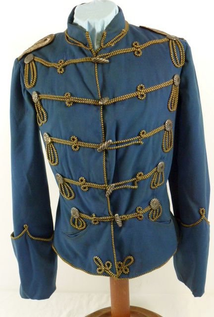 Medium blue wool Attila jacket with white and black piping and cords. The shoulder straps are sewn into the shoulder seams but the buttons are missing. The jacket is heavily padded. The interior lining shows wear, with several tears that are not particularly large. The hook is missing from the hook and eye closure at the collar. The piping on the lower front edge of the jacket is loose and there are some spots of relatively light moth tracking. The jacket is soiled, and it has some spots, but this piece could clean up nicely with careful attention.