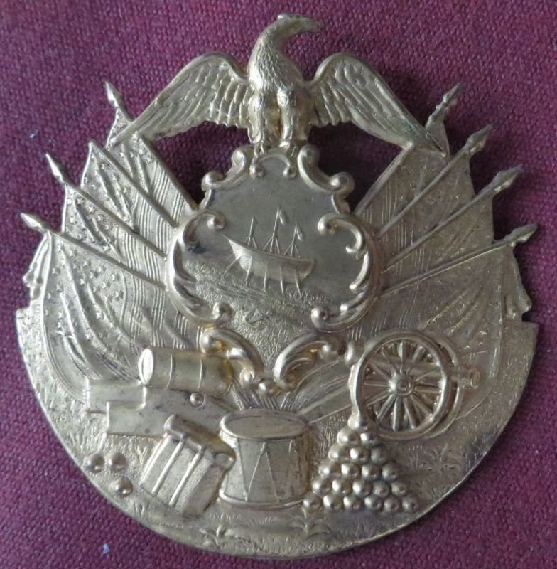 Measures 2 3/4″ X 2 5/8″, gilded brass, 2 wire pins on the reverse.