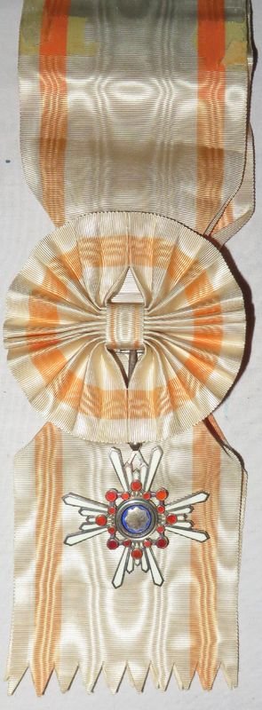 Silver and enameled badge in excellent condition. Sash in fine condition but has two spots of tape residue.