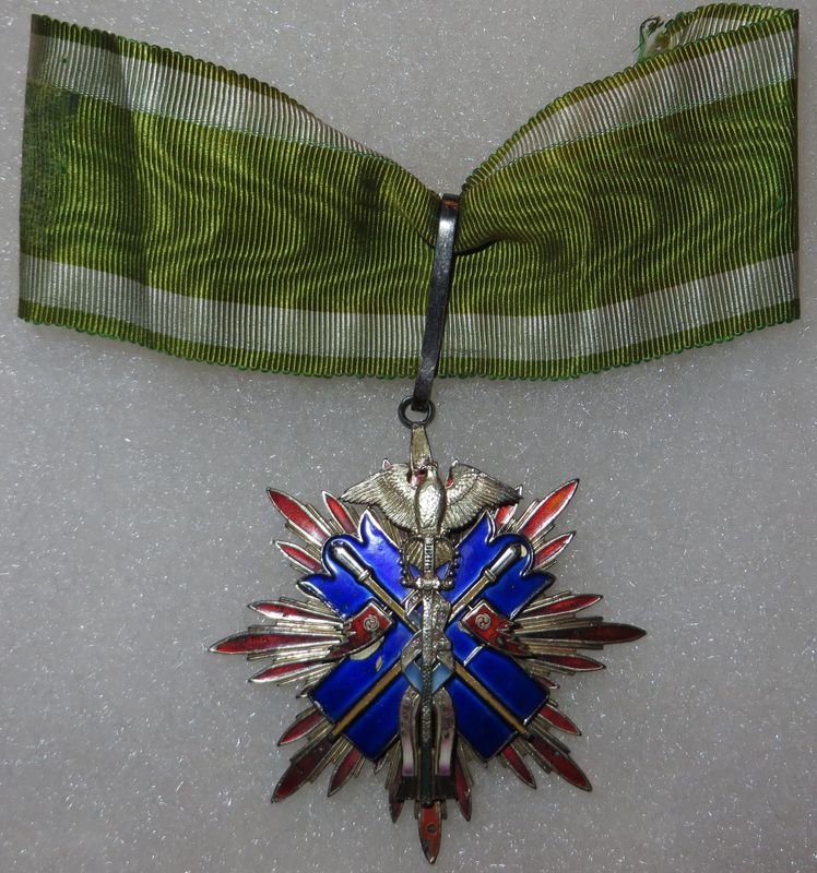 Fine quality medal, silver with enamels, red rays with a few areas of enamel losses, blue enamel has two small chips and red flags show 2 small chips. Reverse missing 2 screws. On a 6″ piece of ribbon.