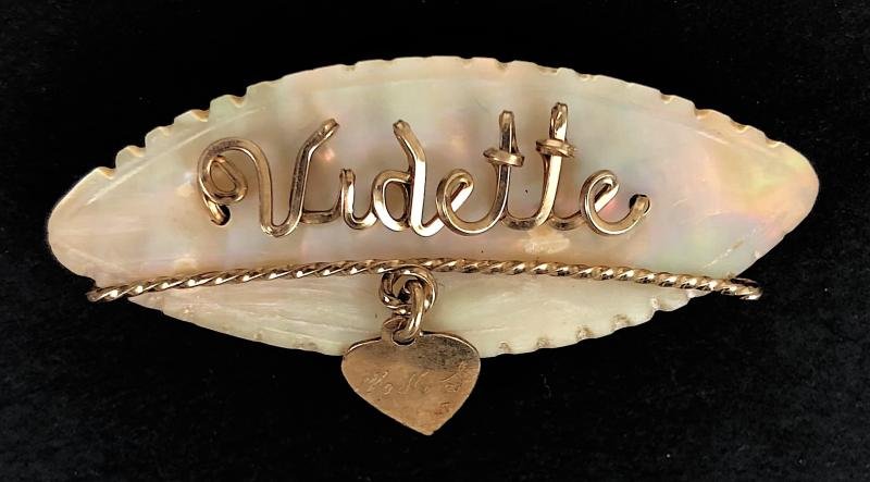 A scarce original First World War period 'H.M.S. Vidette sweetheart brooch', rolled gold hand-crafted wire work mounted on polished mother of pearl oval backing, below a pendant heart engraved 'HMS'. Very good condition.Width approx 48mm.HMS Vidette was an Admiralty V-class destroyer. Built at the end of the First World War, she served in the final months of that conflict, and saw extensive service in the inter war years and in World War II. She was an effective convoy escort and credited with the destruction of five U-boats during the Battle of the Atlantic.