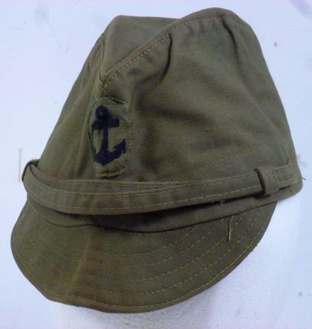 Green cotton enlisted or NCO ranks Navy field cap in excellent condition and showing light use. The cap has a large interior issue stamp. The name 'Orric' is written in small letters on the interior sweatband.
