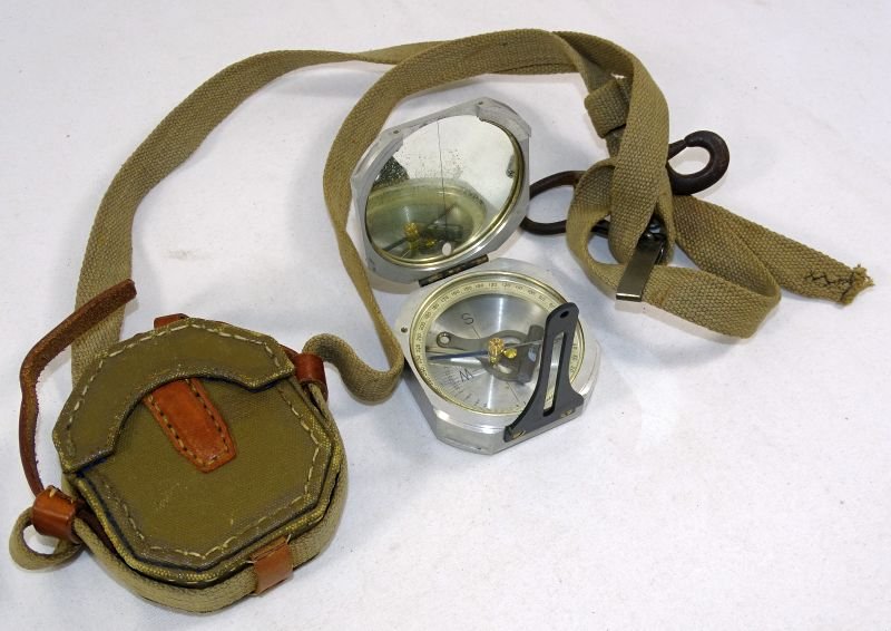 The large, octagonal compass is contained within an aluminum case and it is approximately 2 5/8 inches by 2 5/8 inches by 1 inch deep. It is contained with an olive green canvas case lined in deep blue velvet and complete with small screwdriver. The compass case is worn an a long shoulder strap. Overall excellent condition with minor edge wear to the case and soft pliable leather.