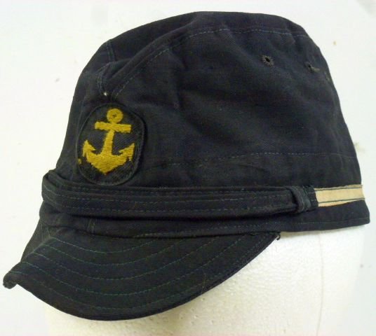 Black cotton cap with the single white stripe of a Petty Officer. The machine woven enlisted / NCO insignia is on the front of the cap. The interior bears the large cloth Navy issue label. The cap shows wear and use but it is in excellent service used condition.