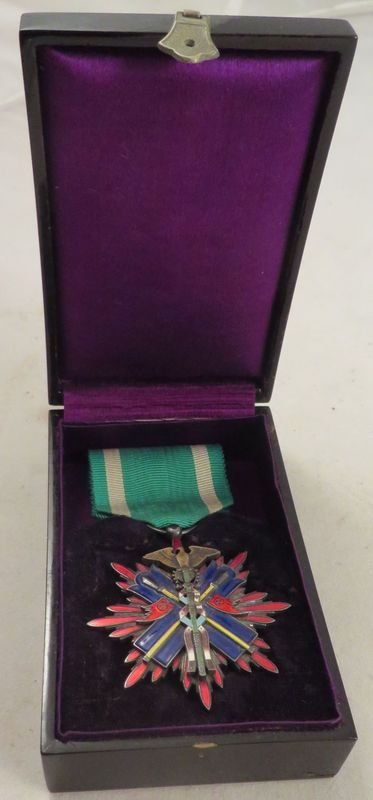 Black lacquered base shows a few minor edge chips and the latch pin is missing. Medal enamels are perfect and original ribbon is excellent.