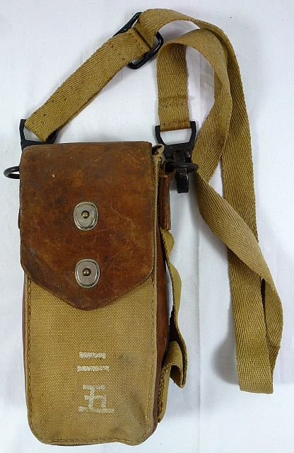 The leather and fabric case for the magazine of the Type 96 light machine gun. The case has the number '2' painted above the number '5' in kanji on the front. The full shoulder strap is attached. 5in wide, 2in deep, 10in long. Excellent field used condition.