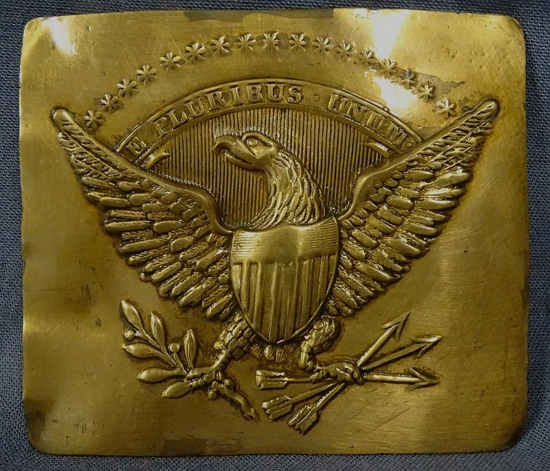 The copper plate die-struck with the eagle panoply. Reverse with applied brass tongue, bar and two iron keepers. Measures 2-3/8″ X 2-3/4″, the face has been cleaned and lacquered, the reverse exhibits an undisturbed patina.