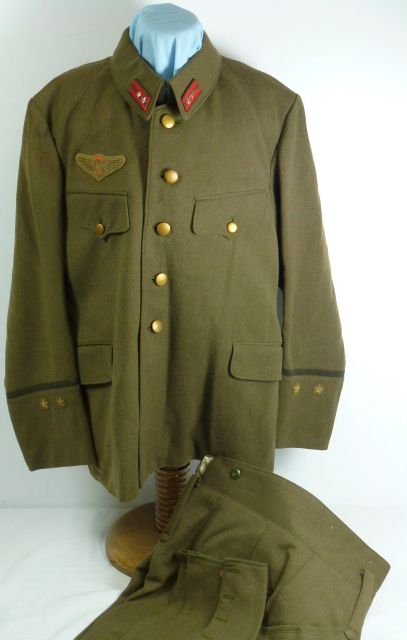 A uniform set, comprised of the wool tunic and breeches, for a 1st Lieutenant of the Japanese Army paratrooper forces. The tunic exhibits, on the right breast the bullion embroidered insignia of an Army airborne paratrooper. The collar and cuff insignia reflect the rank of 1st Lieutenant. The tunic and breeches exhibit light evidence of wear and age, but overall the set is in excellent condition.