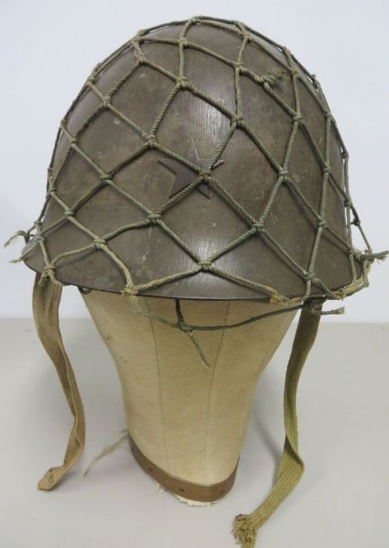 Type 90 combat helmet showing about 95% original paint exhibiting normal scattered scuffs and scratches. The leather liner is pliable just showing minor service wear, missing its pads. Original net with fading, service wear and a few breaks.